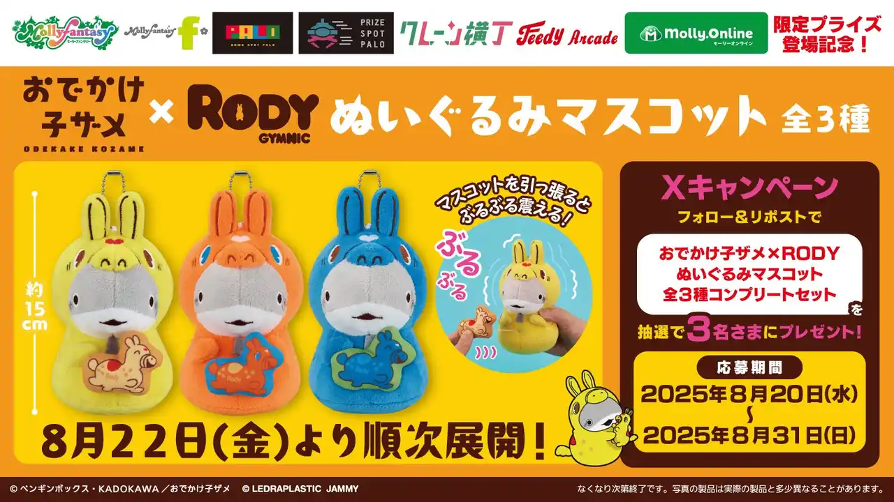 モーリーファンタジー公式Xにて、「おでかけ子ザメ×RODYぬいぐるみマスコット」全3種セットが当たるプレゼントキャンペーンを開催いたします。 |