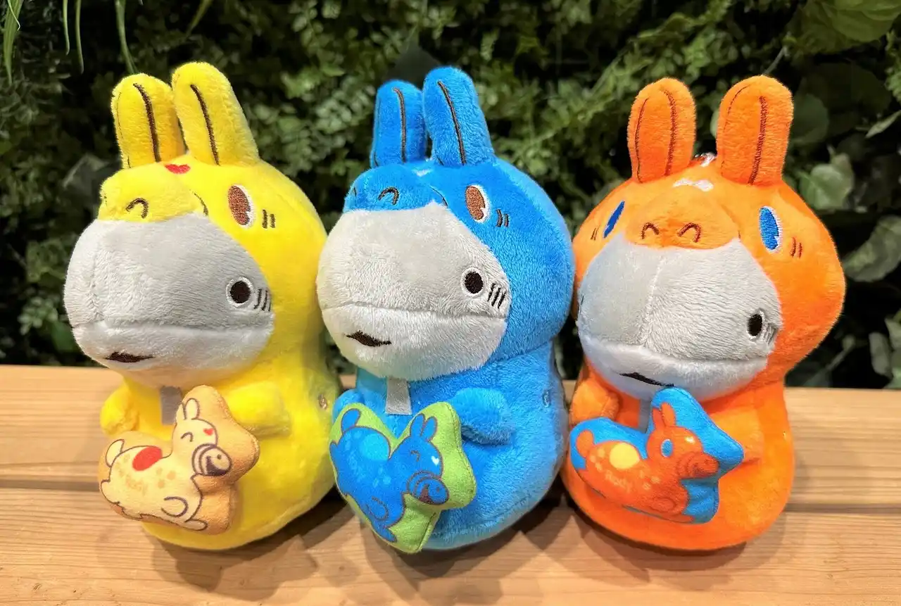 「RODY」の着ぐるみをまとった子ザメちゃん。ブルー・オレンジ・イエローの3色をラインナップ。 |