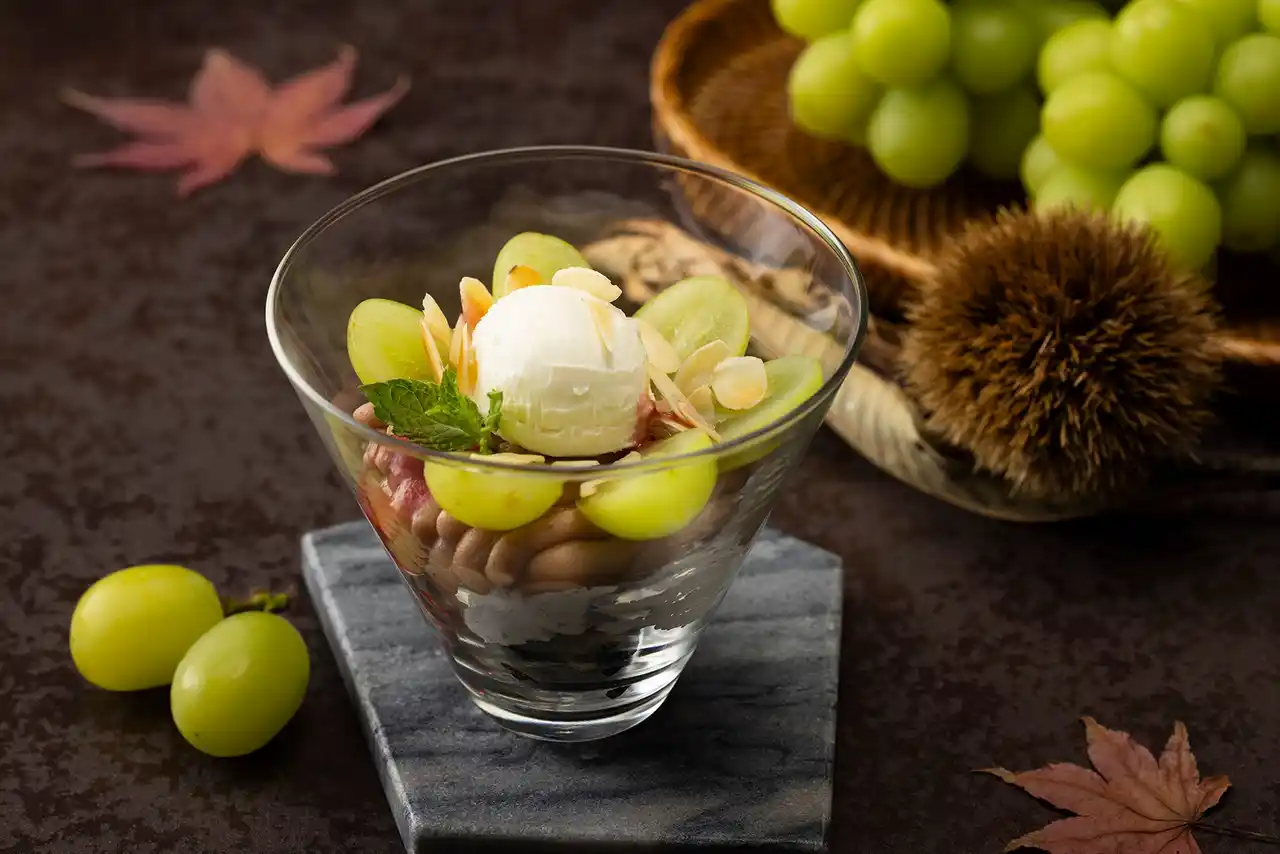 芳醇なぶどうの香りとコク、ほどよい酸味が肉料理に深い味わいを与えます。デザートには、チョコレートブラウニーや胡桃の上に、マロンクリームを絞り、アイスクリームをのせてシャインマスカットを飾り付けたパフェをお楽しみいただきます。また、フリーフローのドリンクには、シャンパン ヴーヴ・クリコをはじめ、7種のオリジナルカクテルと3種のノンアルコールカクテル、12種の香り高い紅茶をご用意いたします。 |