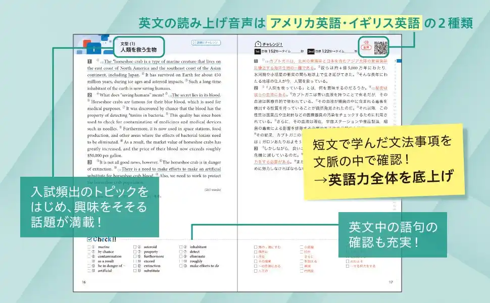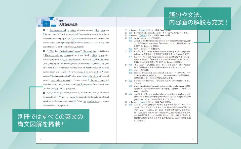 英文レベルは高校1~2年生でも読めるレベルで、巻末には収録英文に構文解析のほか、文法・内容・語句について解説した別冊が付属しています。 |