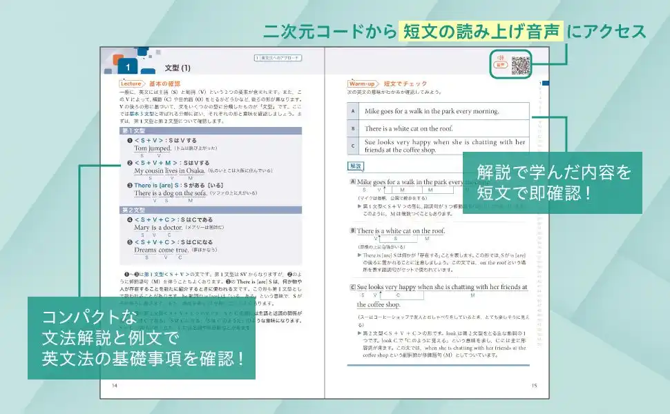 例文(米語)と英文(米語と英語)の音声は、二次元コードから再生できるほか、ダウンロードも可能です。 |