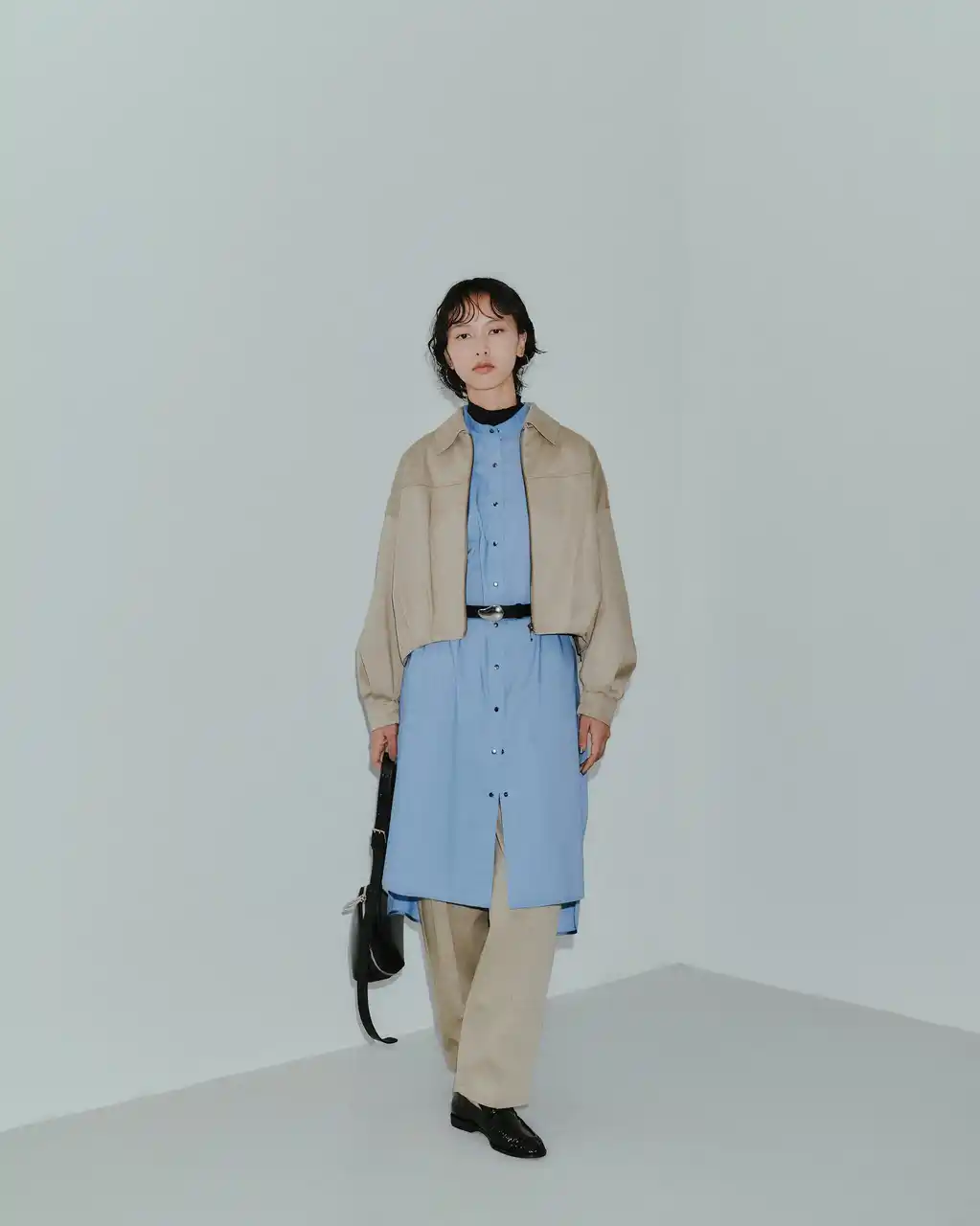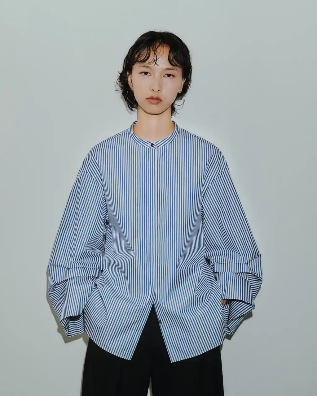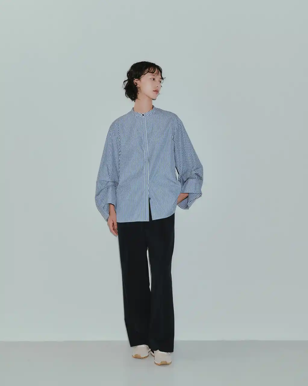 ロング丈のスタンドカラーシャツと合わせることで、モダンなコーディネートが完成します。 |