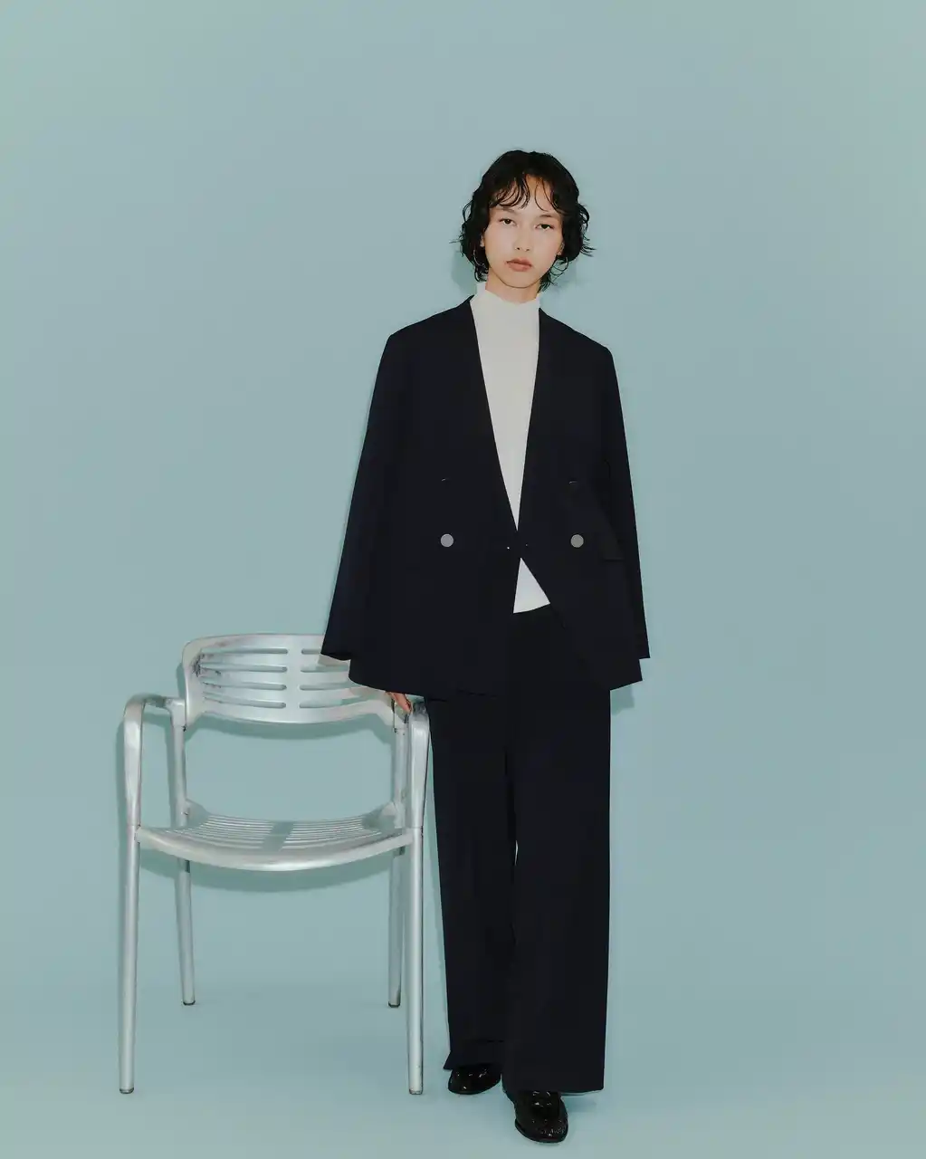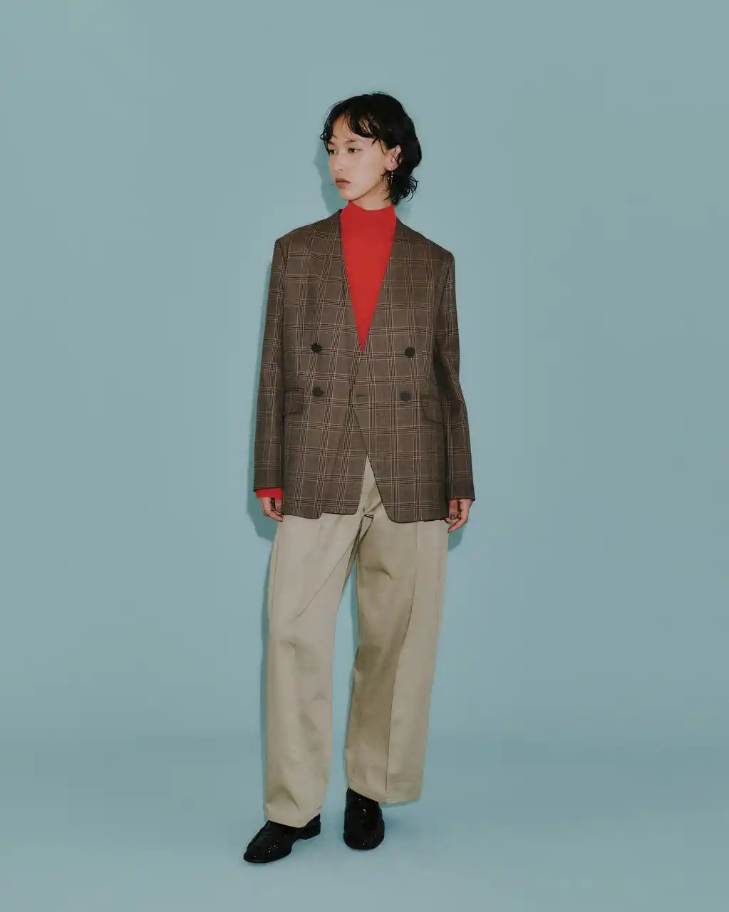 前立てを2枚重ねたような、遊び心のあるフェイクデザインが印象的なジャケットです。ノーカラー、ゆとりのあるシルエット、後ろ部分に入れたタックなど、きちんと感とリラクシーなムードを兼ね備えたデザインなので、ワーキングシーンだけでなくオフの日の装いにも取り入れられます。 |