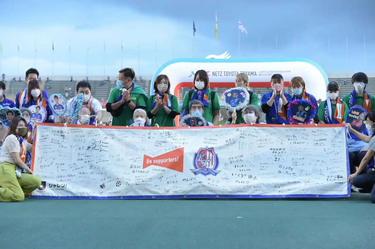 高齢者のエールが刻まれた横断幕掲出の様子(2022年、左:カターレ富山/右:ギラヴァンツ北九州) |