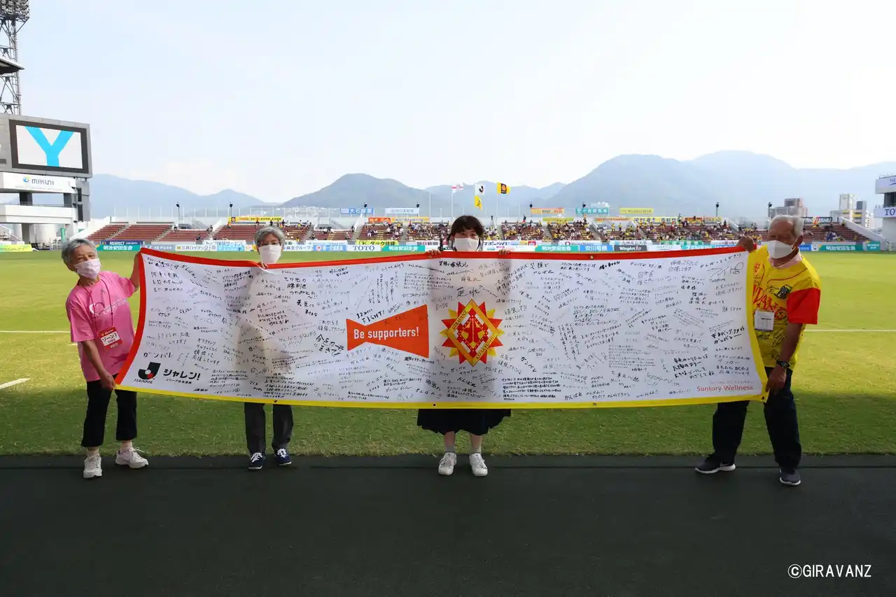 これは、全国のJクラブが、地域の高齢者施設の高齢者の方々から、選手・クラブへのエール(応援メッセージ)を集めて大きな横断幕(横4m×縦1m、クラブによっては複数枚)を制作し、敬老の日がある9月の各クラブのホームゲームで掲出するものです。このたび、今年の参加20クラブの横断幕掲出スケジュールが決定しましたのでお知らせします。 |