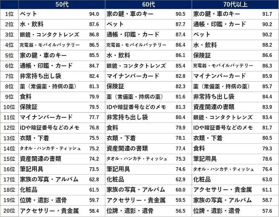 年代別の違いも鮮明です。50代は「水・飲料」「眼鏡・コンタクト」など、まず生活インフラを確保しようとする傾向が顕著。一方、60代以上は「鍵」「通帳・印鑑」といった物理的資産に繋がるものを「あれば安心」という理由で選びます。“ものは資産”という価値観を身につけてきた世代ならではの守り方と言えるでしょうか。 |