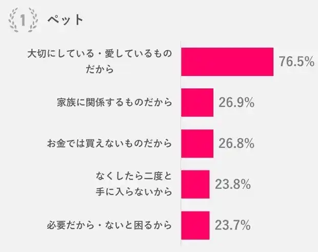 「もしもの時にこれだけは置いていけない○○」の1位は「ペット」。50代で1位だった。理由の1位は「大切にしている・愛しているものだから」、2位は「家族に関係するものだから」、3位は「お金では買えないものだから」だった。 |