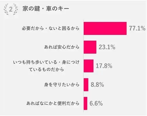 2位は「家の鍵・車のキー」。60代以上で1位だった。理由の1位は「必要だから・ないと困るから」、2位は「あれば安心だから」、3位は「いつも持ち歩いている・身につけているものだから」。 |