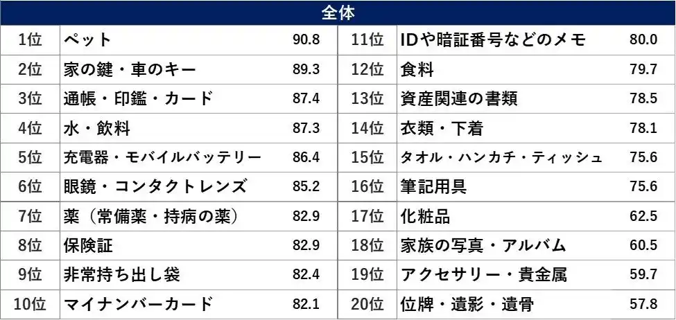 ※なおリリース中では、1位の「ペット」に合わせ「これだけは持ち出そうと決めているもの」を、適宜「これだけは置いていけない〇〇」という表現に変更している。 |