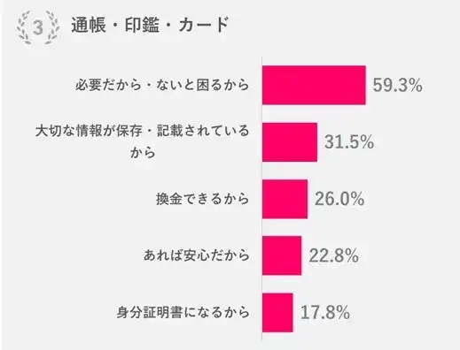 3位は「通帳・印鑑・カード」。70代以上では2位だった。理由の1位は「必要だから・ないと困るから」、2位は「大切な情報が保存・記載されているから」、3位は「換金できるから」。 |