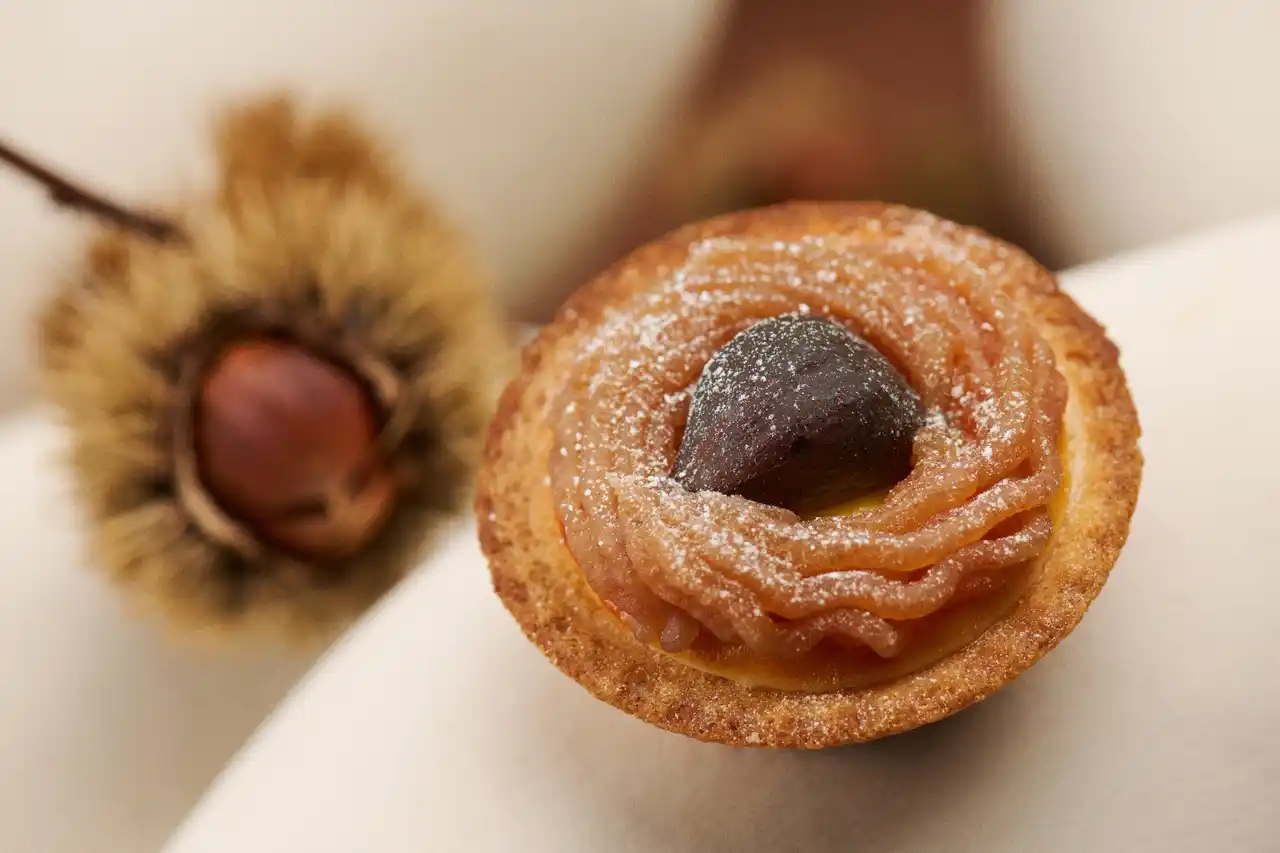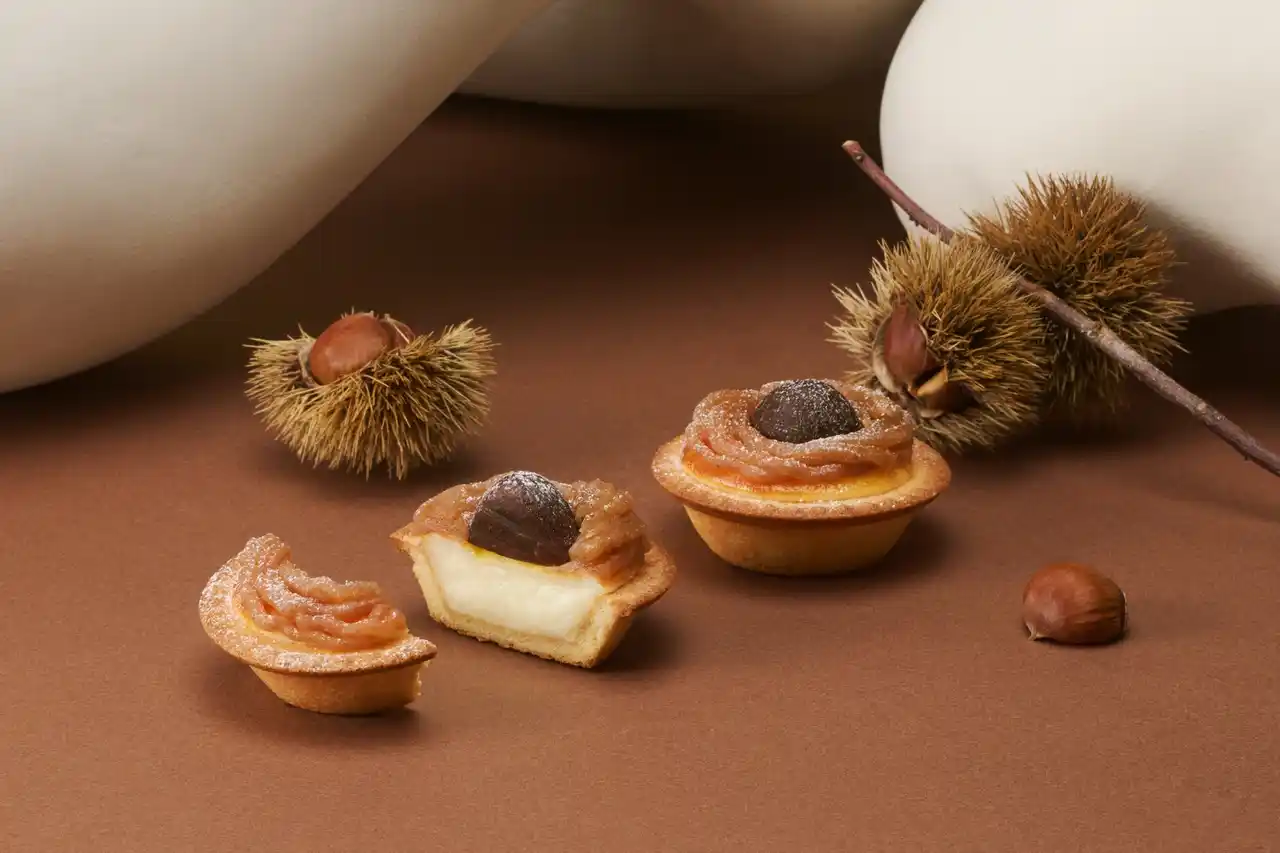 さっぱりと酸味のあるクリームチーズムースの上に、栗の甘みを活かしたペーストをたっぷり絞り、渋皮栗の甘露煮をごろっとトッピング。栗の香りと軽やかなチーズの味わいが重なり合う、旬のタルトです。 |