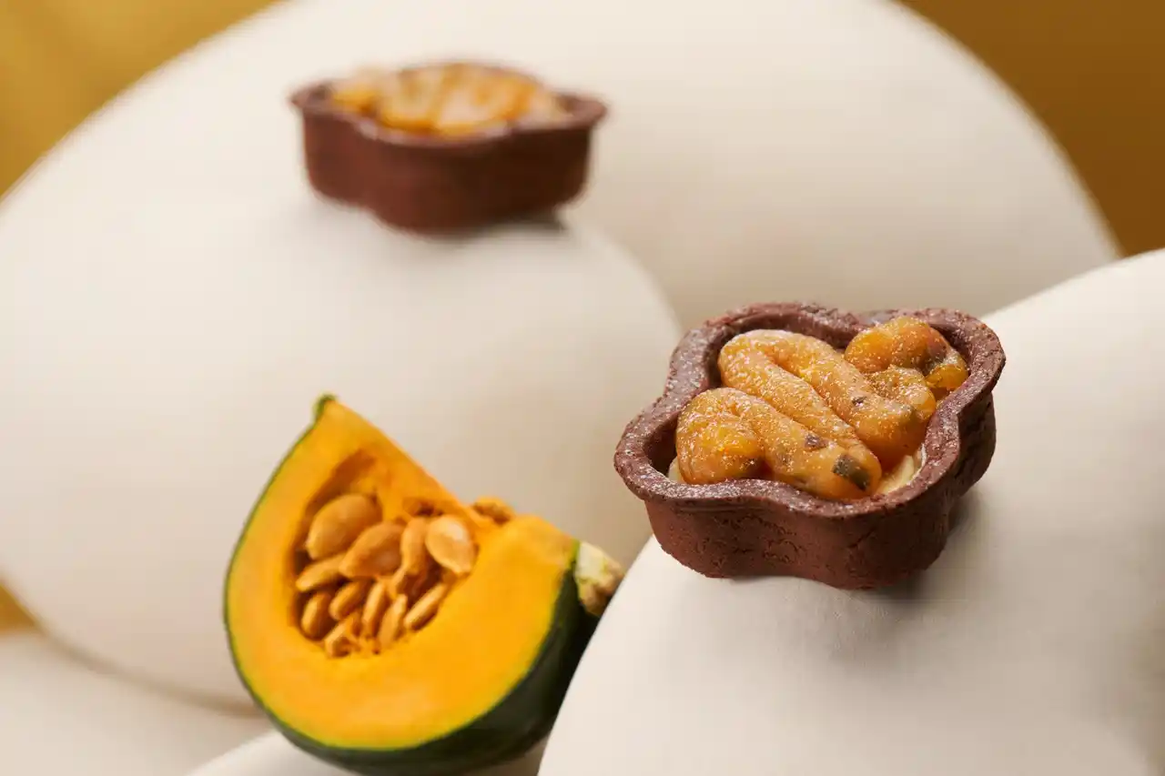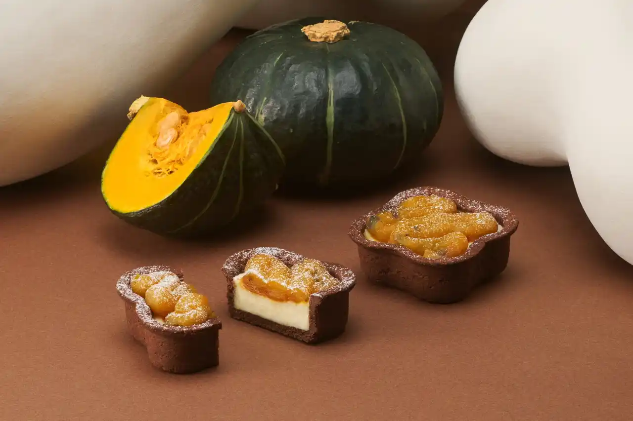 かぼちゃの素材感をしっかりと残したかぼちゃあんを北海道産マスカルポーネを使用したムースとキャラメルソースの上にたっぷりと絞り、旬の味わいを楽しめるチーズタルトに仕上げました。 |