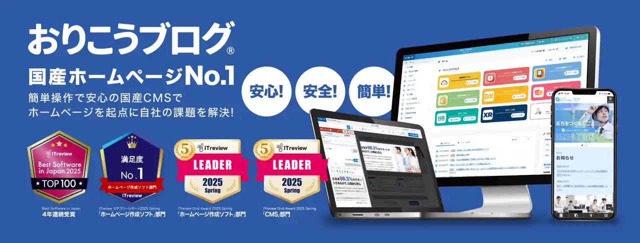 また、レビューサイト「ITreview」において、ホームページ作成ソフト部門で顧客満足度NO.1を獲得し、「Best Software in Japan 2025」TOP100にも選出されています。 |