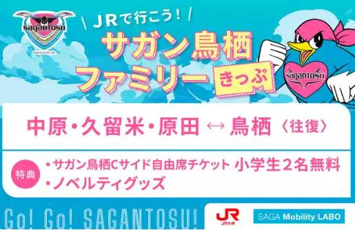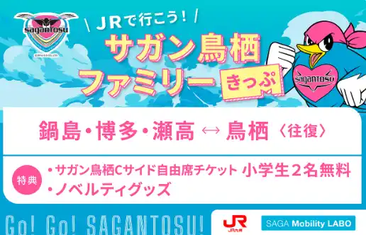 このチケットは、試合開催日に「駅前不動産スタジアム」(佐賀県鳥栖市京町812)周辺で発生する交通渋滞の緩和を目的に、家族でJRを利用して快適にサッカー観戦を楽しんでいただくための特別企画です。内容は、JR鳥栖駅までの往復乗車券(大人1名・小児2名)、C席サイド自由の観戦チケット3枚(大人1名・小学生2名)、ノベルティグッズがセットになっており、各試合日につき100枚限定で販売されます。 |