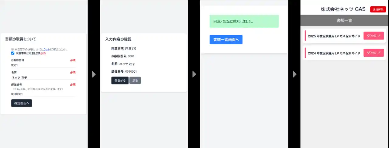 | ユーザーが本人認証を完了し、電子送付に対する同意を完了することで、PDFデータがダウンロード可能なページに遷移します。 | |||||||||