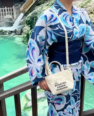 (4)『草津温泉プリン』の人気キャラクター『湯もみプリンちゃん』と『LOWRYS FARM』のダブルロゴ「草津温泉」では浴衣姿で散策を楽しむ方々も多く、「和装にも合う使い勝手の好い雑貨を作りたい」との思いから、可愛くて持ち歩く際に嵩張らず、財布やスマートフォン、ペットボトルなどがしっかり収まって丁度好いお洒落なバッグやポーチを、生地や色にもこだわってデザインいたしました。