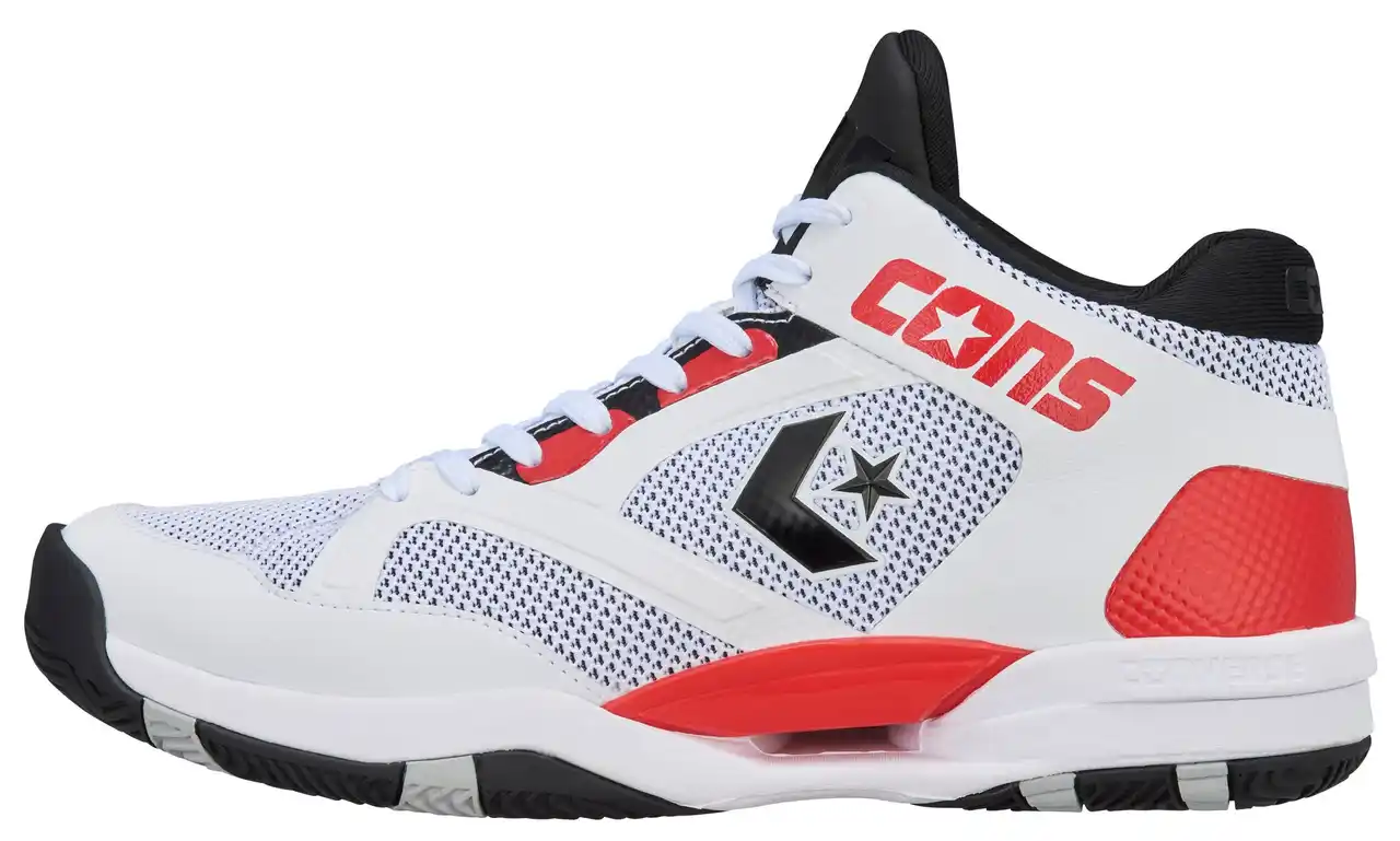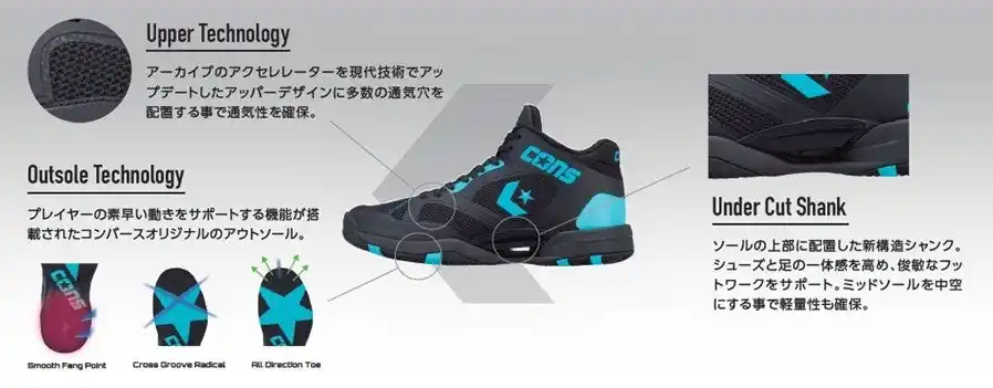 コンバースのバスケットボールシューズの中でも名作の一つである「ACCELERATOR」を現代の技術でアップデートしたモデルのミッドカットタイプ。ソールの上部に配置されている新構造シャンクによりシューズと足の一体性を高め、俊敏なフットワークをサポート。さらに、軽量性とクッション性に優れた中空ミッドソール、通気性に優れたオープンセル構造のPU&E.V.A.カップインソールを搭載しています。 |