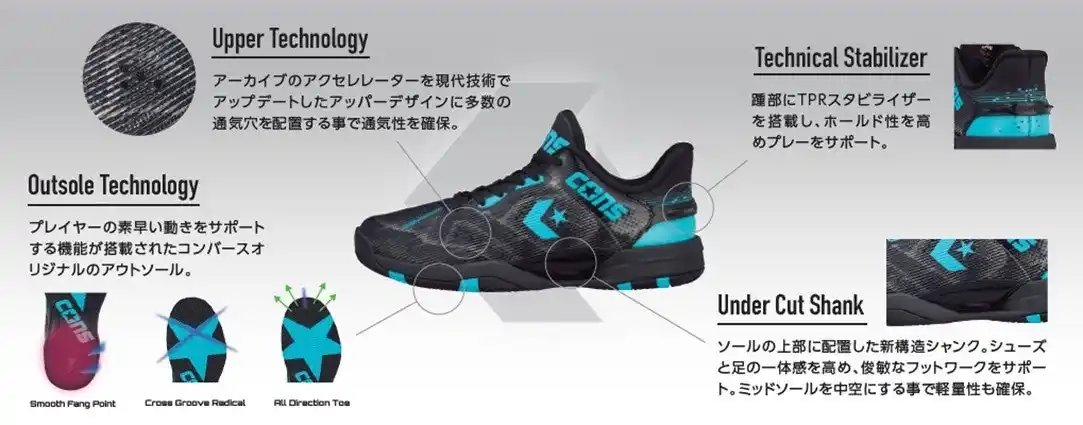 コンバースのバスケットボールシューズの中でも名作の一つである「ACCELERATOR」を現代の技術でアップデートしたモデルのローカットタイプ。ミッドカットと異なるアッパーデザインは多数の通気穴を配置する事で通気性を確保。また踵部にTPRスタビライザーを搭載する事でホールド性もアップ。ソールの上部に配置されている新構造シャンクによりシューズと足の一体性を高め、俊敏なフットワークをサポートします。さらに、軽量性とクッション性に優れた中空ミッドソール、通気性に優れたオープンセル構造のPU&E.V.A.カップインソールを搭載しています。 |