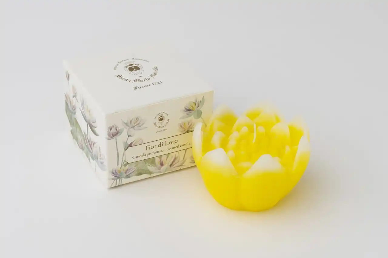 今回のリニューアルオープンを記念して、「ロータスフラワーキャンドル イエロー」が同店舗限定で発売されます。キャンドルは、ルネサンス期にフィレンツェで栄華を極めたメディチ家の庭園に咲いていたと伝えられる蓮の花に着想し、サンタ・マリア・ノヴェッラの職人が蝋の注入から仕上げに至るすべての工程に丁寧な手作業を加えて、仕上げられています。幸福や祝福を象徴する黄色のキャンドルが、優美なフローラルノートと爽やかなグリーンティーの香りをまとい、秋の夜長を清らかに照らします。 |