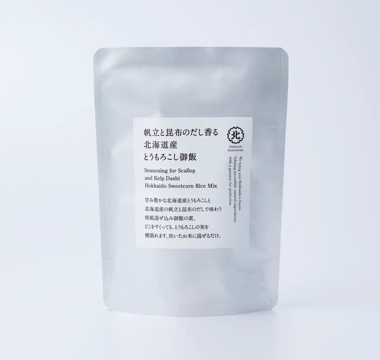 甘み豊かな北海道産とうもろこしと、北海道産の帆立と昆布のだしで味わう和風混ぜ込み御飯の素です。どこをすくっても、とうもろこしの実を頬張れます。 |