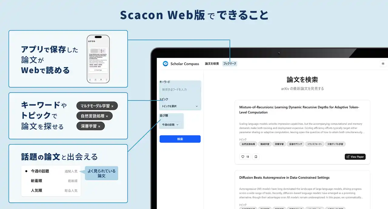 モバイルとPCの連携による研究体験の向上 5月にリリースしたモバイルアプリ版「Scacon」は、スワイプ操作で気軽にAI研究論文を発見できるサービスとして、研究者やAI愛好家の皆様にご利用いただいております。一方で、論文の詳細な内容を読む際には、より大きな画面で快適に閲覧したいというご要望を多くいただいておりました。 |