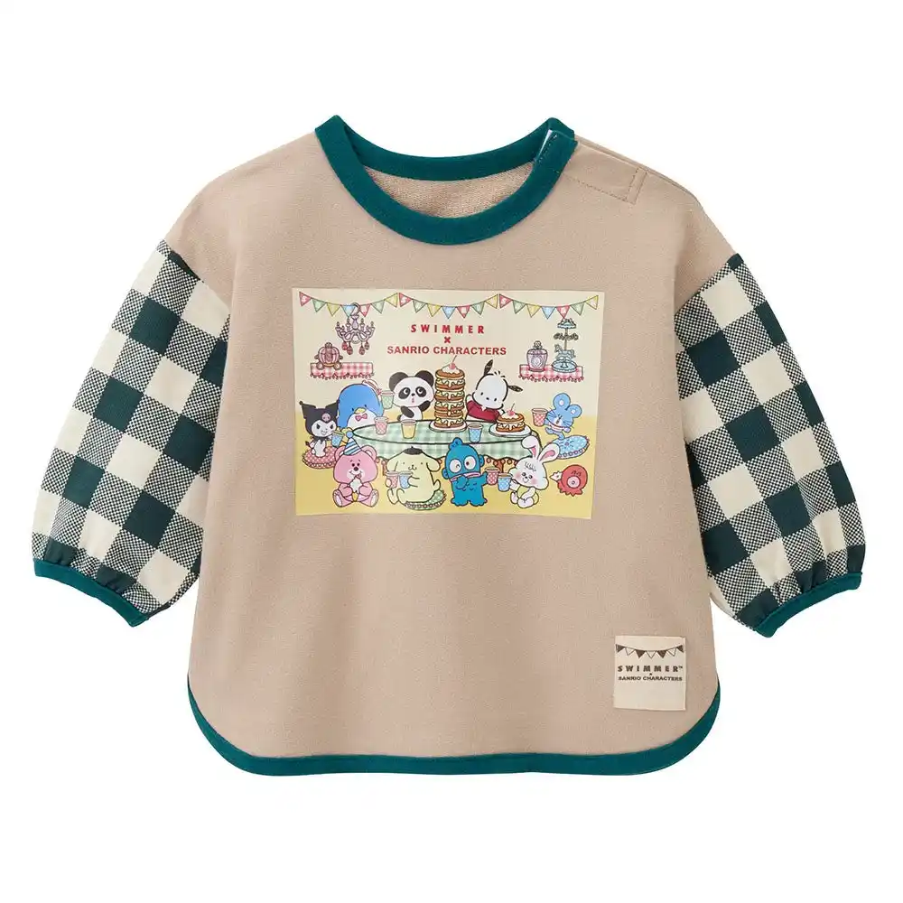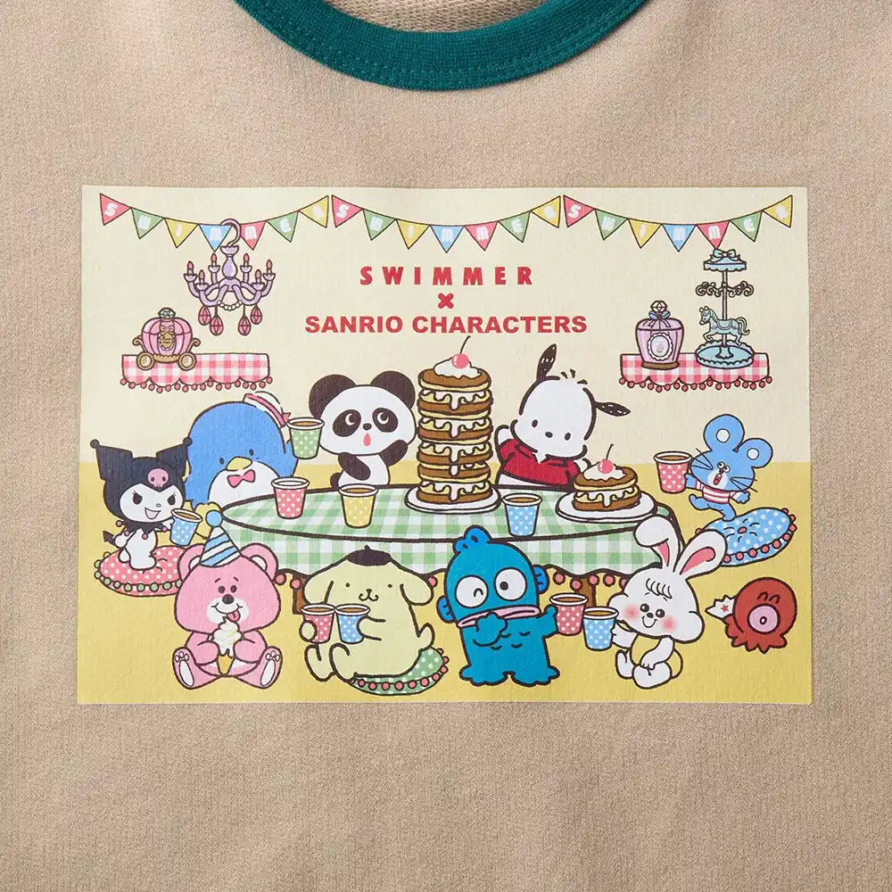フロント部分にはスイマーオリジナルの動物のキャラクターと、サンリオキャラクターズが仲良くテーブルを囲むイラストをプリントしました。袖にはチェック柄をデザインし、可愛くポップなデザインに仕上げています。 |