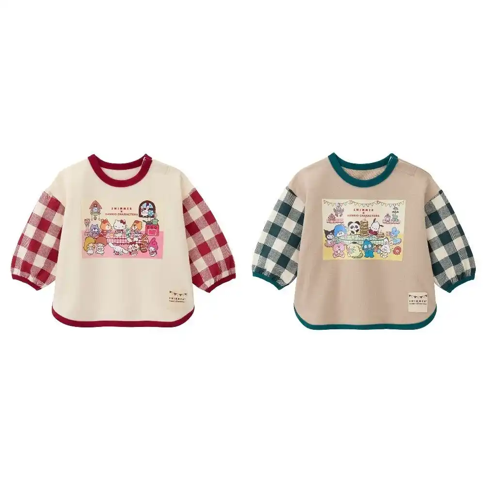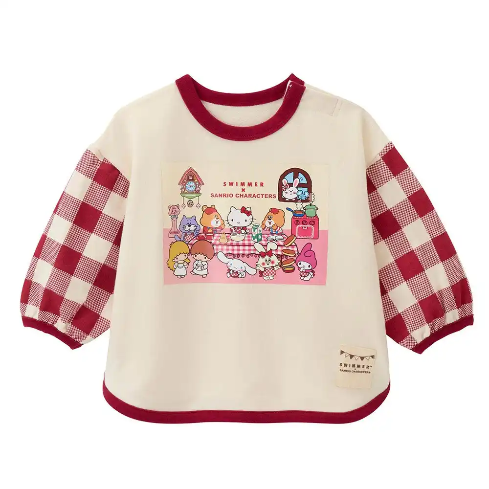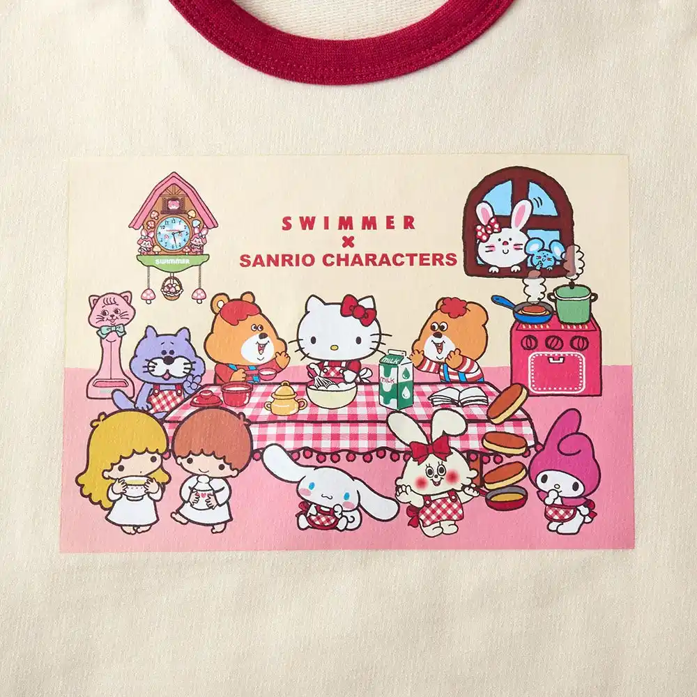 ハローキティ、マイメロディ、シナモロール、リトルツインスターズ(キキ&ララ)とスイマーのキャラクターがテーブルで仲良くパンケーキ作りを楽しんでいるデザインをプリントしました。アイボリーの身生地に赤いチェック柄の袖が映える遊び心のあるデザインです。 |