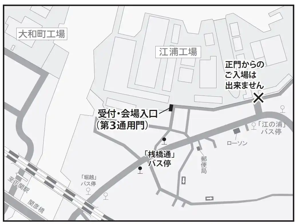 | 2.工場及び工場周辺には駐車場がありませんので、ご来所の際は公共交通機関を利用ください。 | |||