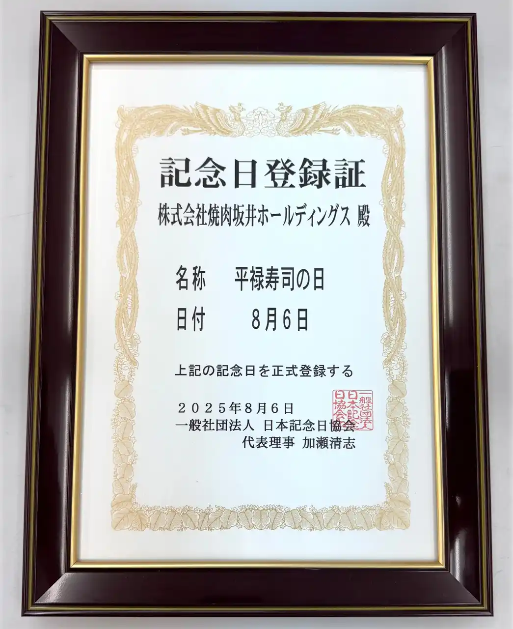 株式会社 焼肉坂井ホールディングス(本社:名古屋市北区、代表取締役社長 高橋仁志)は毎年8月6日を「平禄寿司の日」として一般社団法人 日本記念日協会に申請し、承認をいただきました。記念日は1号店がオープンした日が1967年8月6日(日)に由来いたします。 |