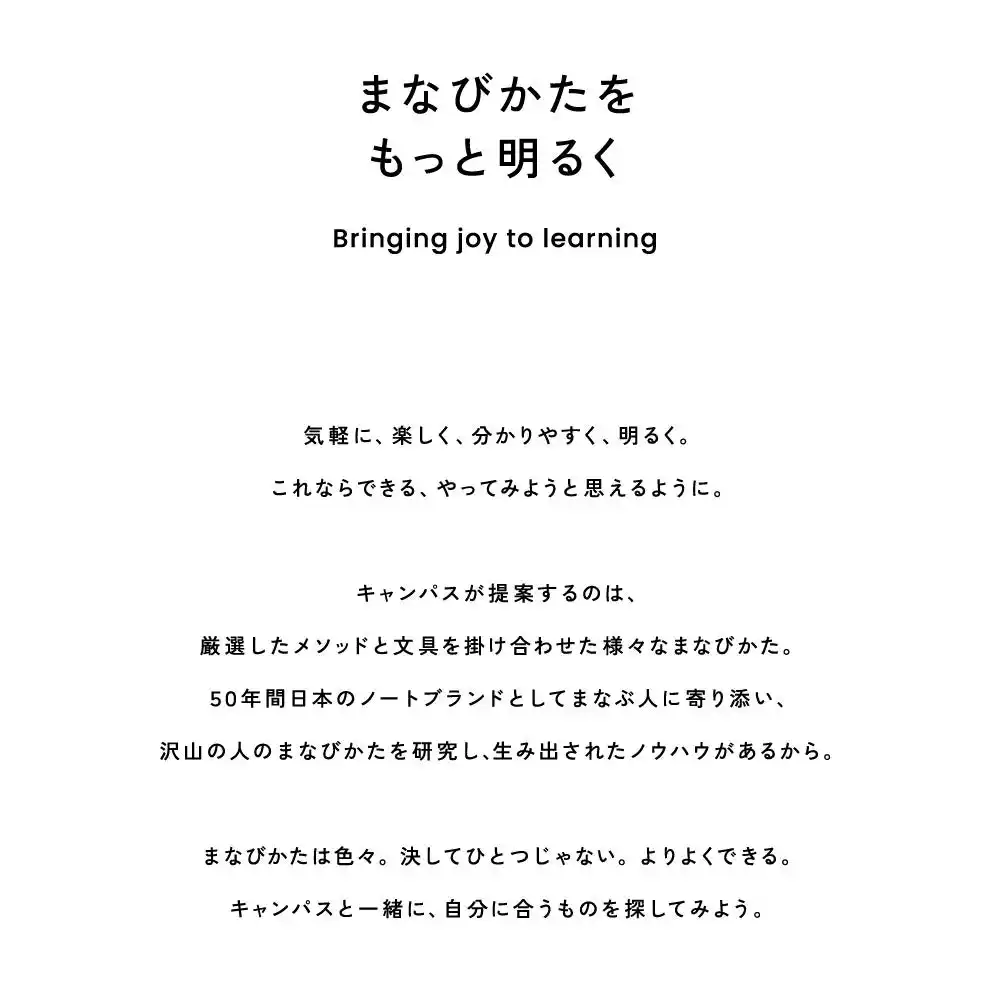 新たな“Campus”は、50年間蓄積してきた「書く」ことへの深い理解と、学生のまなびへの知見を組み合わせることで、一人ひとりの可能性を最大限に引き出す「まなびかたブランド」として、新たな価値を創造してまいります。 |