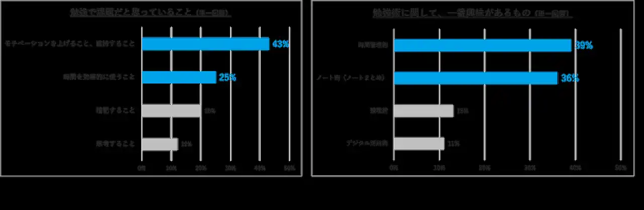 コクヨの調査(2024年10月実施/n=1,586名)によると、学生が勉強で課題を感じていることは「モチベーションを上げる・維持すること」「時間を効率的に使うこと」でした。また、勉強術で興味があるのは、「時間管理術」「ノート術」が上位となりました。まずは学生の顕在ニーズに応えるべく、モチベーションや時間の有効活用に繋がるレシピを提案します。 |