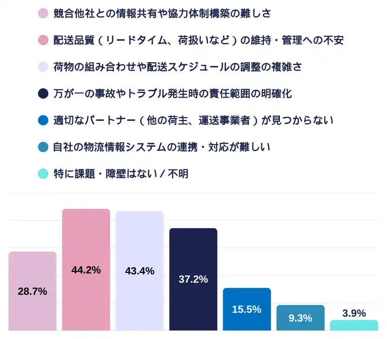 | 特に、品質やスケジュール調整といった運用面の課題が上位に来ている点は、各社がこれまで築き上げてきた自社の物流サービスレベルを維持したいという強い思いの表れでしょう。これらのリアルな懸念を払拭しない限り、共同配送の本格的な普及は難しいと言えます。 | |||||||||||||||