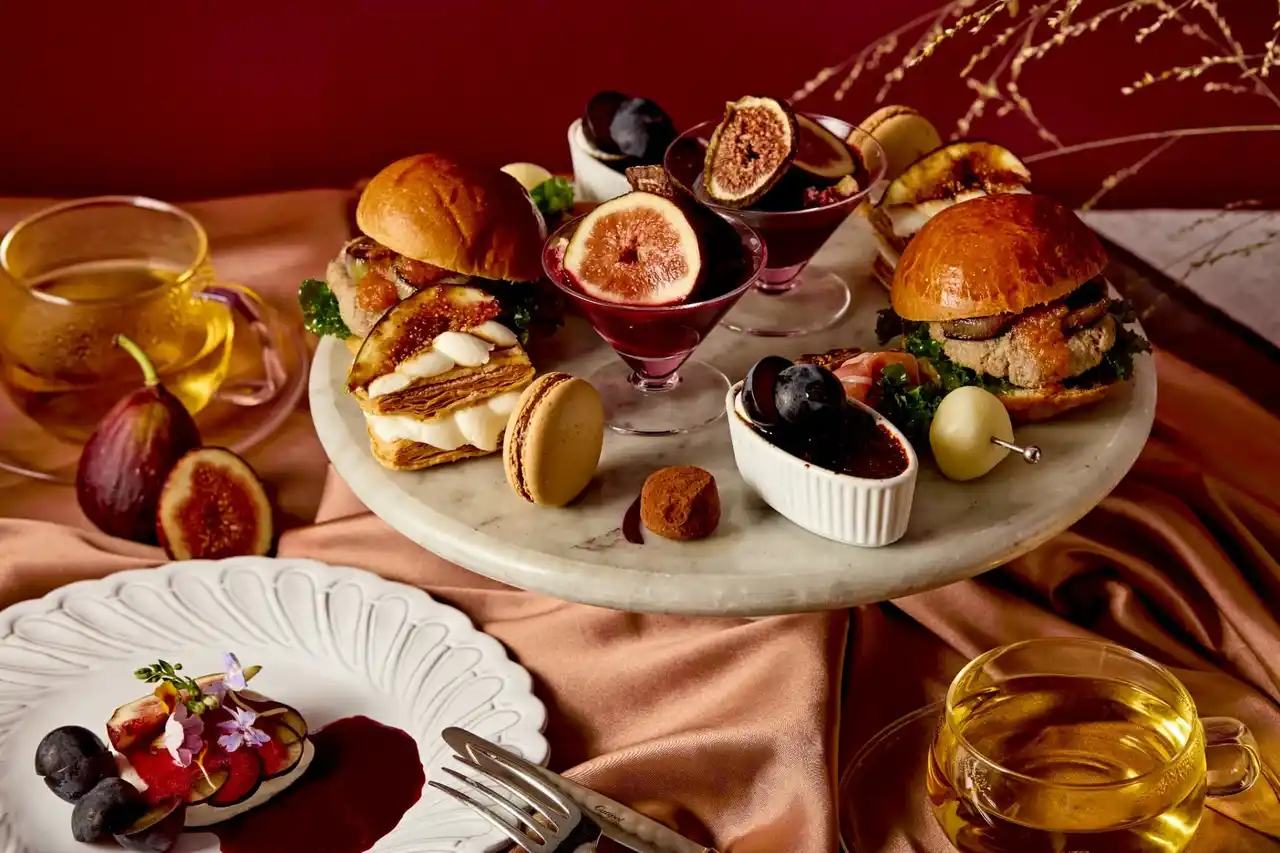 黒葡萄に含まれるポリフェノールは、古くから“若々しさを保つ秘訣”として知られ、凛とした美しさを引き出す果実として愛されてきました。また、無花果は“美の果実”と呼ばれ、豊富な食物繊維やミネラルが内側から健やかさを整えます。 そんな美容や健康にも嬉しい二つの果実を主役にした「黒葡萄と無花果のアフタヌーンティー」が登場します。 |