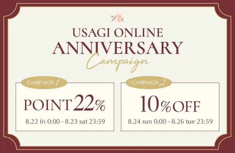株式会社ウサギオンライン(本社:東京都千代田区/代表取締役社長:須藤 誠)が運営するオンラインデパートメントストア「USAGI ONLINE(ウサギオンライン)」は2025年8月にデビュー12周年を迎えます。 12周年を記念し、8月22日(金)~8月26日(火)の期間、感謝祭と銘打ち 期間限定一律22%ポイントキャンペーンの実施や、USAGI ONLINEでしか買えない限定アイテム、12周年にちなんだ12星座コレクション、話題のイケメンの登場など楽しい企画を順次展開いたします。 |
