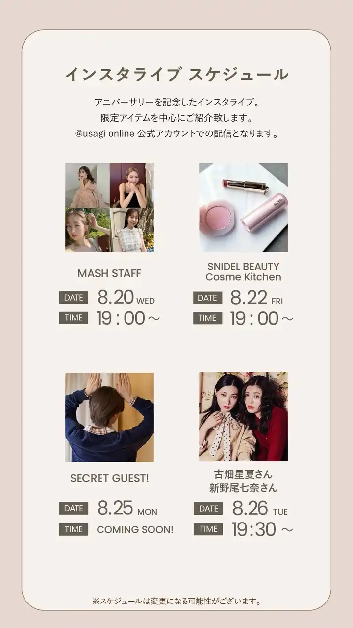 スペシャルゲストとともに、USAGI ONLINE 限定アイテムなどをご紹介いたします。 |