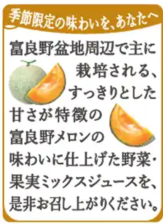 今回着目した富良野盆地は、一日の寒暖差が大きく、メロン栽培に適した気候を持つ地域であり、北海道を代表するメロン産地の一つとして知られています。このたび発売する「野菜生活100 本日の逸品 北海道富良野メロンミックス」は、すっきりとした甘さが特徴の富良野メロンの味わいの野菜&果実100%ミックスジュースです。自分へのご褒美に、贅沢感や季節感を楽しみながら手軽に野菜をとりたいときにぴったり。おやつやデザートタイム、リラックスしたいシーンにもおすすめです。 |