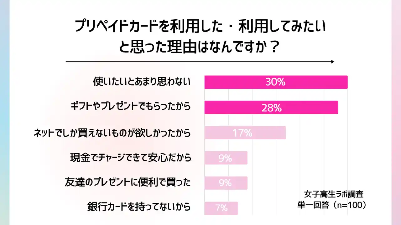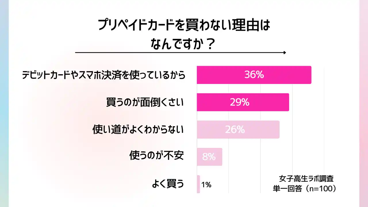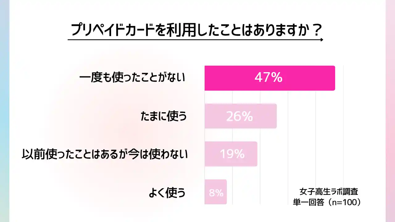 ティーン向けエンタテインメント事業を展開する株式会社with t(本社:東京都渋谷区、代表取締役社長:宮城啓太)が運営する「女子高生ラボ」は、最新トレンドに敏感な女子高生で構成された女子高生ラボメンバーに向けて、現役女子高生の「プリペイドカード利用」に関する実態調査を実施しました。今回の調査では、プリペイドカードを普段から利用している女子高生は少数派であることが明らかになりました。キャッシュレス化が進む一方で、現金での支払いが今も主流であり、高校生の生活スタイルやお金の使い方に合わせた決済手段の選択傾向が見えてきました。 |