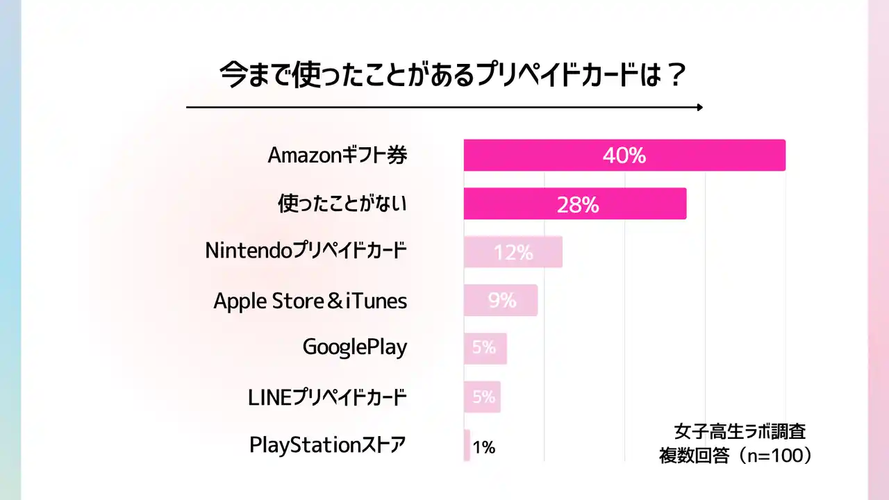 今まで使ったことがあるプリペイドカードを聞いたところ、「Amazonギフト券」が40%と最も多く、女子高生の間で広く利用されていることがわかりました。その他、「Nintendoプリペイドカード」(12%)や「Apple Store&iTunesカード」(9%)といったゲームや音楽関連のカードも一定の支持を集めていますが、全体としては一部の人気カードに利用が集中している傾向が見られます。プリペイドカードを使う女子高生は全体としてまだ少数派ですが、それでも幅広い種類のプリペイドカードが利用されている点は意外で興味深い結果です。ネット通販やゲーム、音楽など多様な目的で使われており、使い道の広がりが見えてきます。 |