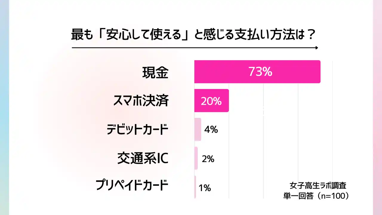 また、キャッシュレス決済が普及するなかでも、安心して使える支払い方法としては「現金」が圧倒的多数を占めており、キャッシュレスを利用している層の中にも、現金の安心感を重視する声が根強く存在していることが明らかになりました。プリペイドカードは毎日使うものではないけれど、あると便利な存在。決済方法の選び方にも、日常生活のリアルなニーズと柔軟な判断力が表れており、現役女子高生ならではの消費行動の特徴が見えました。 |