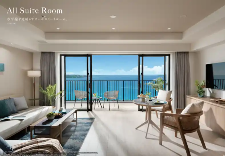 すべての客室が50平方メートル 以上のスイート仕様で、ゆとりあるリビングと6mのワイドスパンが、外の景色と心地よくつながります。全室にバルコニーを設け、時間とともに表情を変える空と海を、何もせずに眺めるだけの贅沢なひとときをお過ごしいただけます※。室内にはキッチンや洗濯機、収納付きのエントランス空間も備え、長期滞在にも最適です。 |