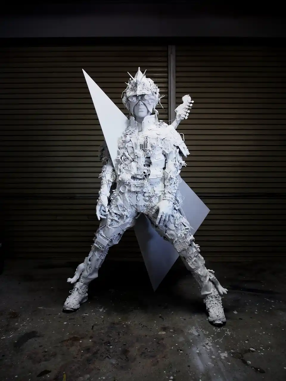 大野は、音楽カルチャーの視点を取り入れたアプローチを基軸に、内面から湧き上がる「衝動」を創作の原動力とし、プラスチックや使えなくなった楽器など、日常にあふれる様々な人工的な素材を組み合わせて造形する「ブリコラージュ」と呼ばれる手法を用いて作品を制作するアーティストです。 |