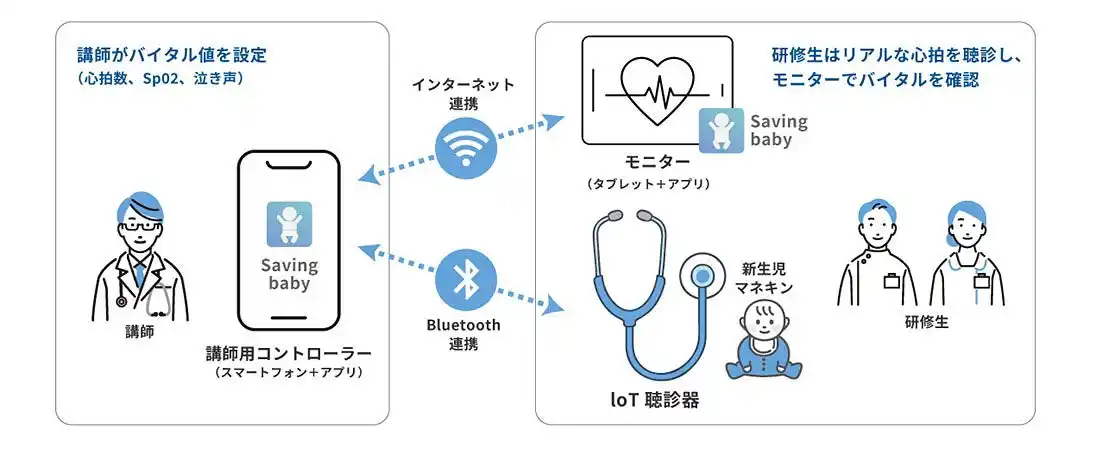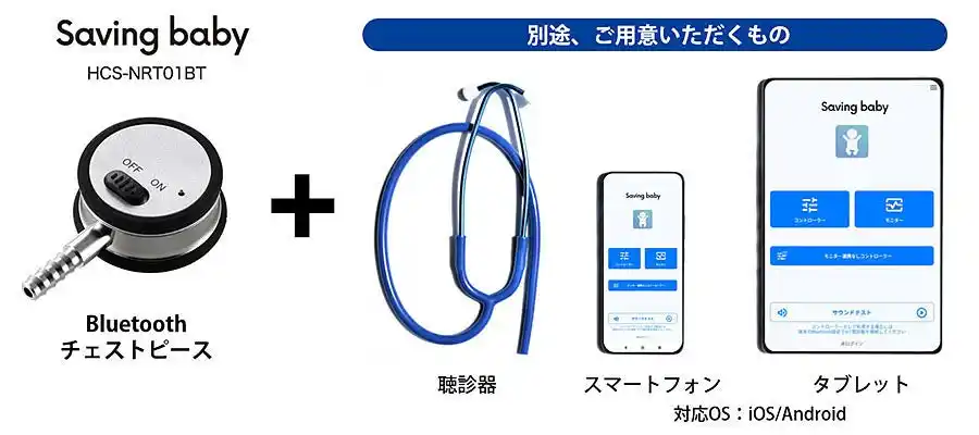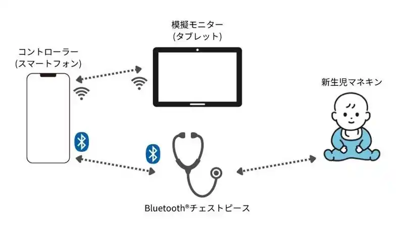 浩一)は、聴診器やスマートフォン、タブレットと組み合わせることで、低コストで新生児蘇生法シミュレーション訓練ができる専用アプリ付き補助デバイスを、8月下旬より新発売いたします。 本製品は、従来の高価な専用システムを使わず、スマートフォンやタブレットと組み合わせて使用できる、新生児蘇生法シミュレーション訓練用の補助デバイスです。 聴診器に取り付ける「Bluetooth(R)チェストピース」と、スマートフォンやタブレットにインストールして使う専用アプリで構成され、通信技術とIoTを活用することで導入コストを抑え、維持管理も容易です。専用アプリ「Saving Baby」をスマートフォンにダウンロードして「Bluetoothチェストピース」と連携すれば、スマートフォンを訓練用のコントローラーとして使用できます。また、タブレットなどにインストールすれば、訓練時のバイタル表示用モニターとして利用できます。訓練生はモニター表示や聴診から得られるバイタル情報をもとに処置を行い、指導者はコントローラーからバイタル数値を変更できるため、双方にとって実践的で効果的なトレーニングを実現します。 |