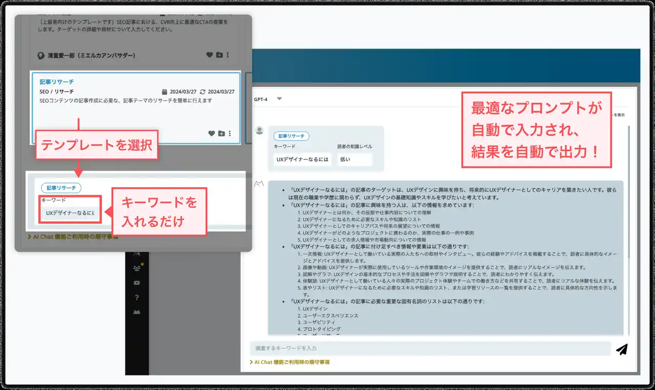 入力内容をテンプレートとして保存し、繰り返し利用することが可能です。ユーザーは同じプロンプトを毎回入力する必要なく、一度作成したテンプレートを使用して効率よく作業を進めることができます。また、社内の他のユーザーにもプロンプトのテンプレートを共有できるので、全メンバーが効率的に作業を進められます。 |