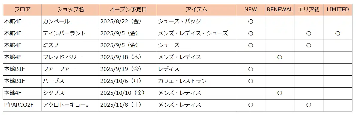 | ■池袋PARCO 2025年秋NEW&RENEWAL SHOP 一覧 | |||||||||||||||