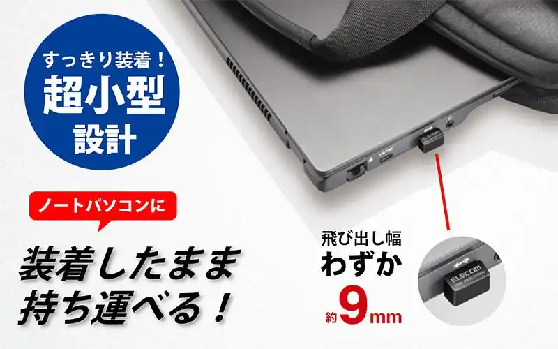 ノートパソコンや業務用パソコンに装着しても、飛び出す部分はわずか約9mmです。装着したまま持ち運んでも邪魔になりません。 |