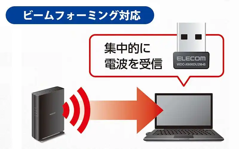 ルーターやアクセスポイントから離れた場所でも集中した電波を受信できる「ビームフォーミング」機能にも対応しています。 |