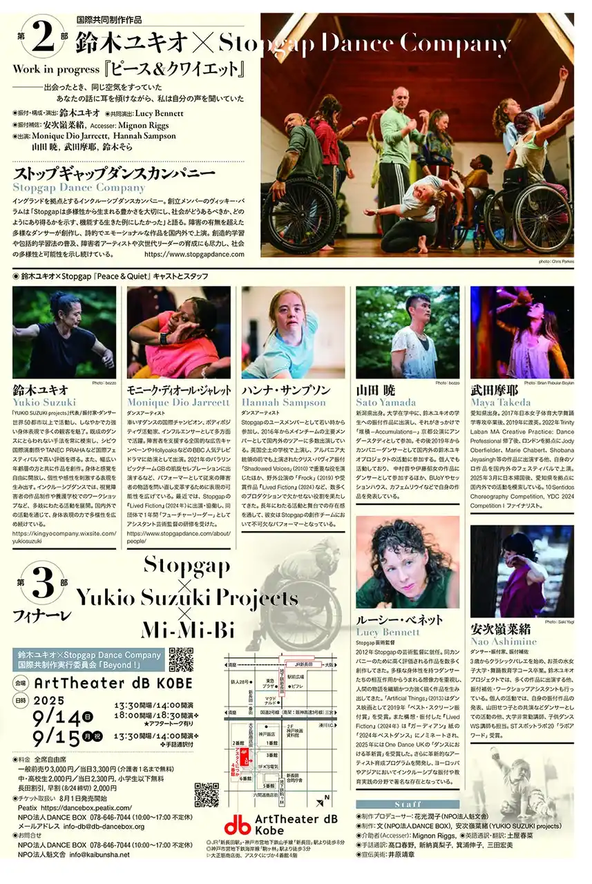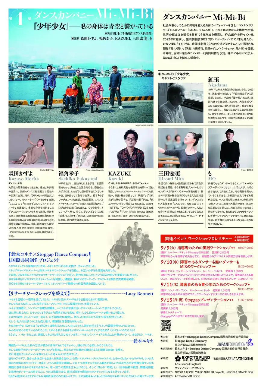 Beyond!は、鈴木ユキオとイギリスのインクルーシブダンス Stopgap Dance Company の数年にわたる交流から生まれたプロジェクト。2年をかけコラボ作品を創作する。今年度は、両国でのクリエイションの過程を発表するshowingと、ゲストパフォーマンスに日本のダンスカンパニー Mi-Mi-Biを迎えた2作品を競演する。 |