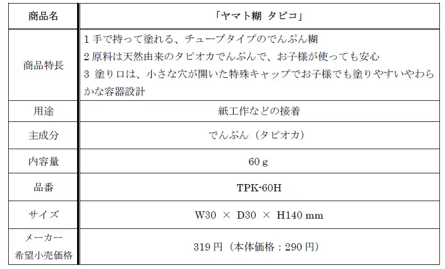 | 「ヤマト糊 タピコ」は、手を汚さず容器から直接塗ることができるチューブタイプのでんぷん糊です。塗り口は、小さな穴が開いた特殊キャップとし、お子様でも塗りやすいやわらかな容器設計で、スムーズに糊を塗り広げることができます。『手で直接塗りたくないけれど安心な素材の糊を使いたい、使わせたい』といった一定数のお客様の声から生まれました。原料は『ヤマト糊』同様、天然由来のタピオカでんぷんを使用し、安心してご利用いただけます。 | |||||||||