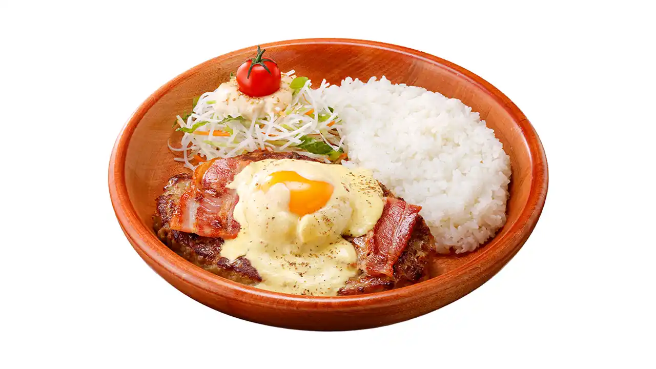 ベーコン、マッシュポテト、オランデーズソースにとろ~り卵黄がマッチした、食べ応えのある一品。オランデーズソースとハンバーグソースはご飯にもよく合います。 |