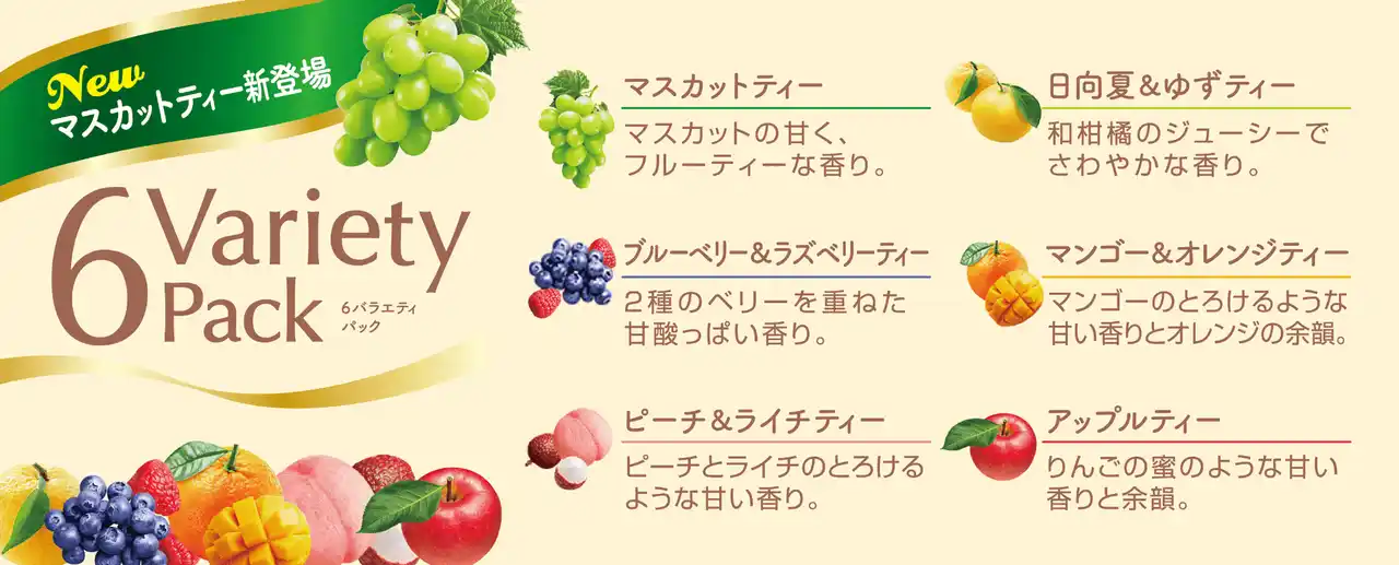 ●気分で選べる6種類のフレーバー! 新フレーバーの「マスカットティー」をはじめ、「日向夏&ゆずティー」や「マンゴー&オレンジティー」など、豊富なバリエーションで日々のティータイムを彩ります。気分に合わせてフレーバーを選び、お家やオフィスなどでのリフレッシュタイムにぜひお試しください。 |